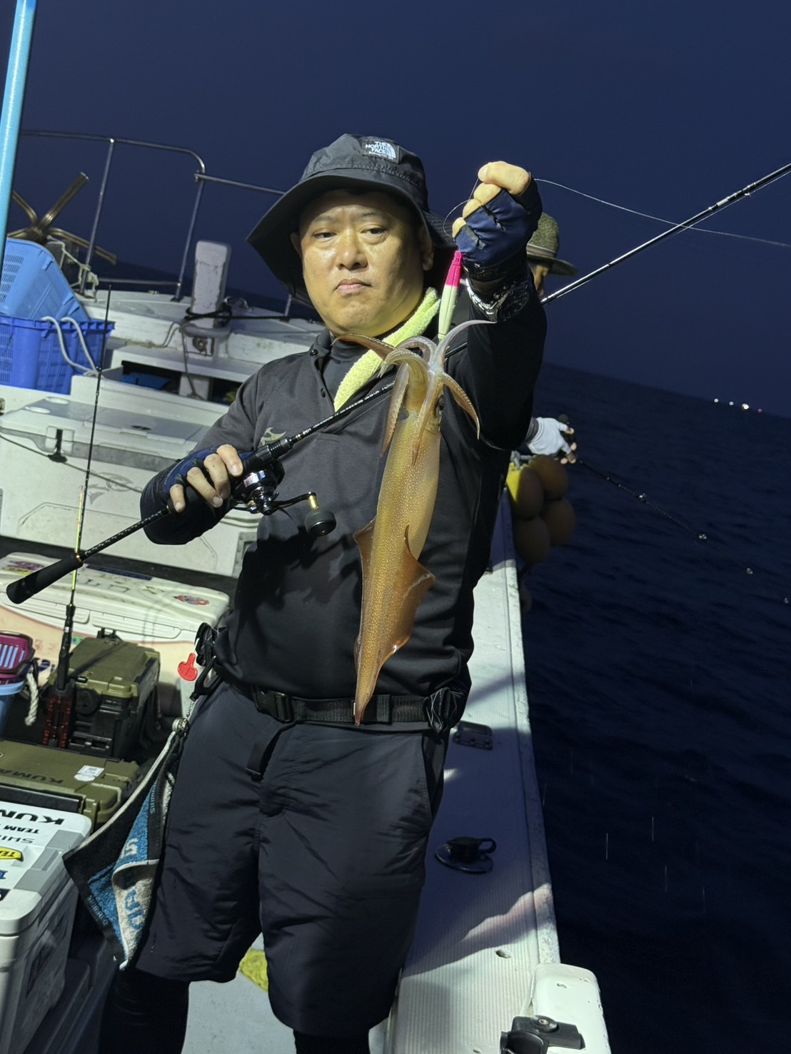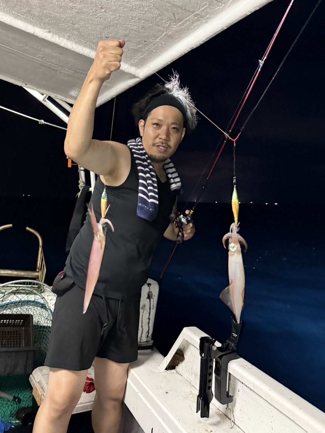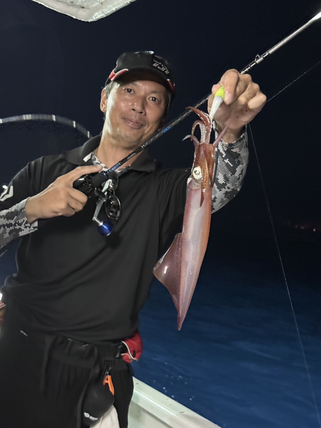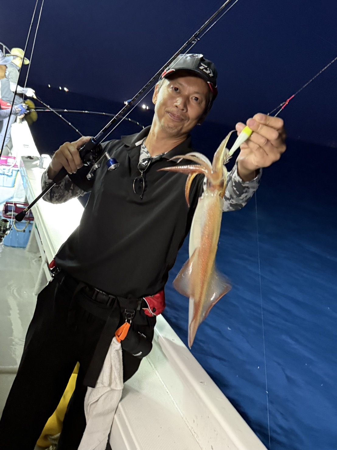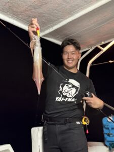 この日は少し早めに唐泊漁港を出船。風に船を立てて流しながら、夜焚きイカ釣りをスタートしました。序盤はポツポツとイカを拾っていく展開。やがてパラシュートを入れる時間になり、夜焚きの準備も整いました。日が沈んだ直後は当たりも少なめ。それでも、イカのエサとなるベイトが集まりはじめると、ようやく時合いに突入。ここから一気に当たりが出はじめ、船上は活気ある雰囲気に。今回は全体的に良型が多く、ダブルヒットの確率もかなり高め。数を狙う方もいれば、型にしぼってじっくり拾っていく方も。小イカをリリースしてくれる釣り人も多く、最終的には釣る人で60〜70杯ほどとなりました。イカのサイズも申し分なく、皆さんの笑顔が印象に残る一日となりました。