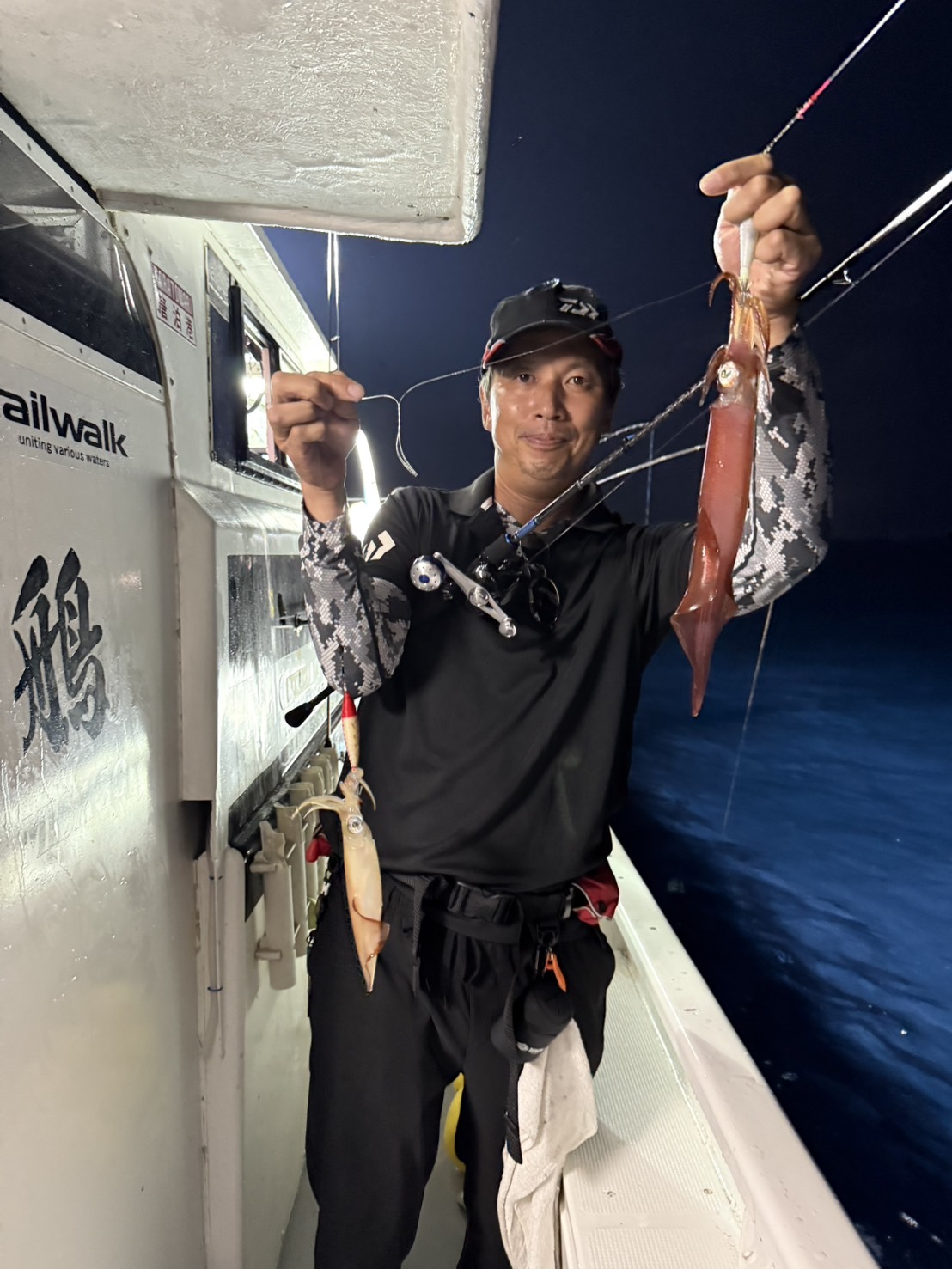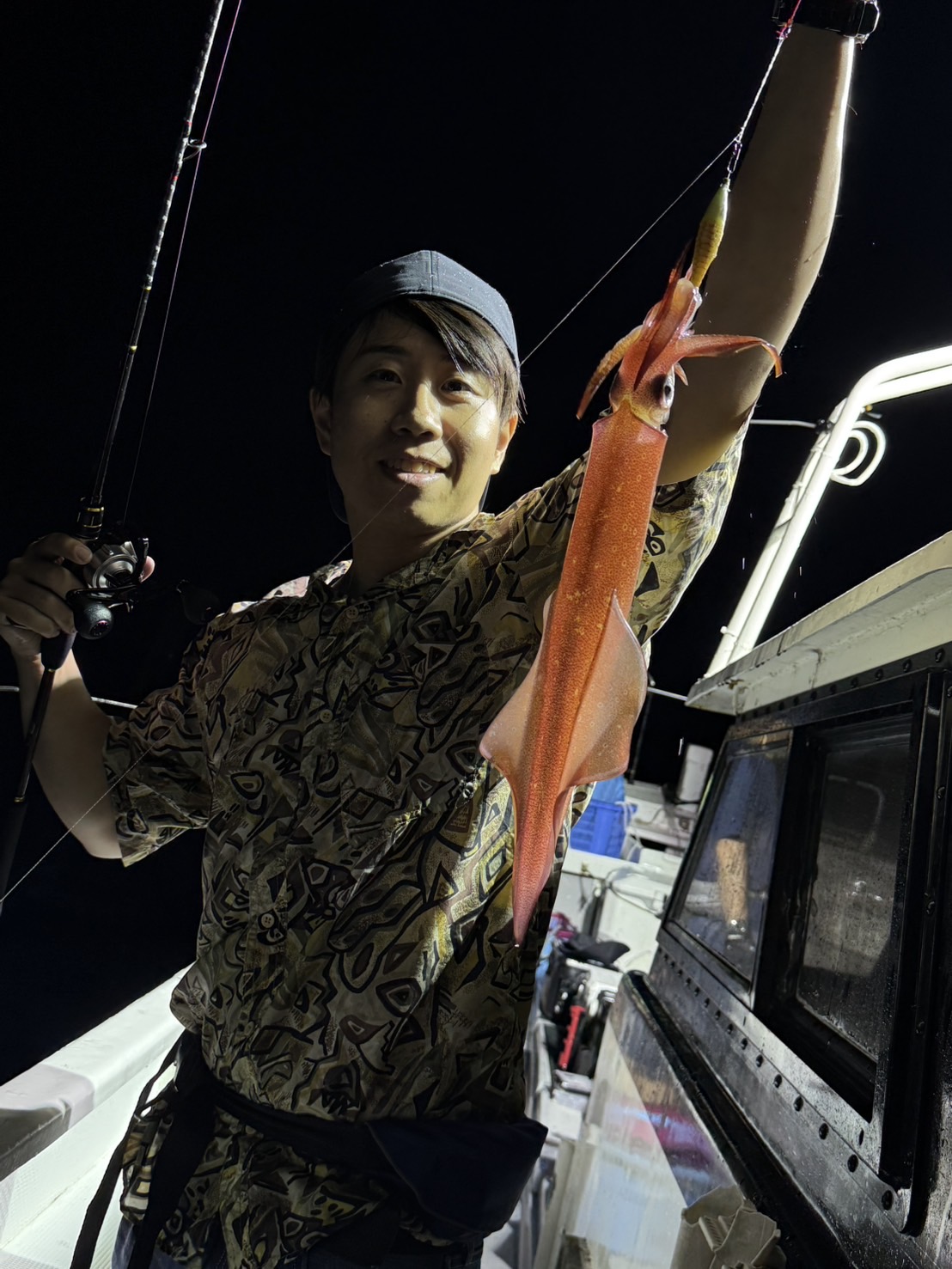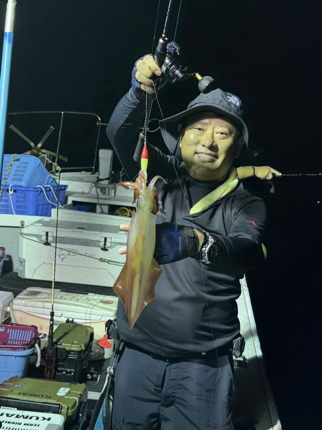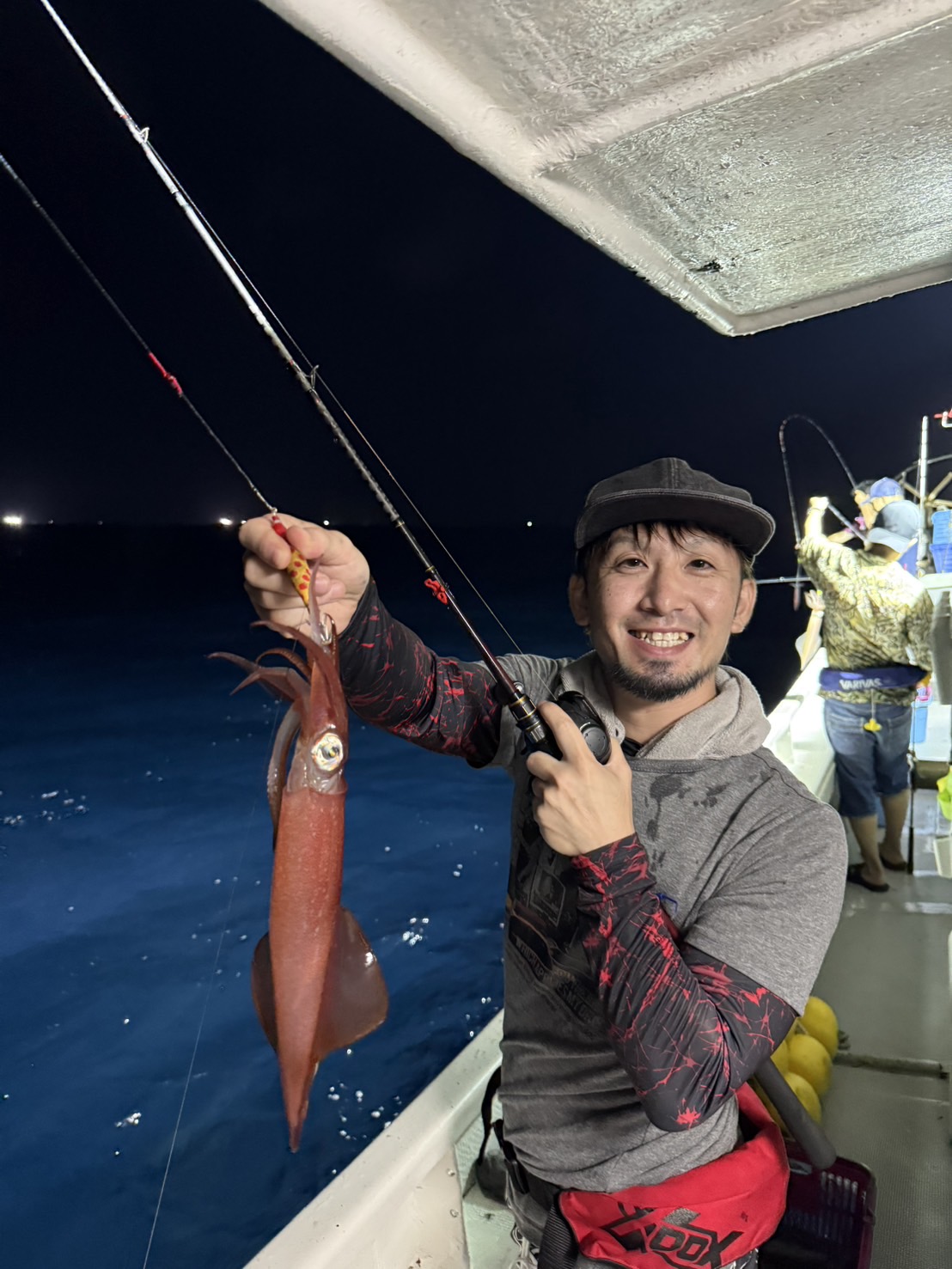 この日は少し早めに唐泊漁港を出船。風に船を立てて流しながら、夜焚きイカ釣りをスタートしました。序盤はポツポツとイカを拾っていく展開。やがてパラシュートを入れる時間になり、夜焚きの準備も整いました。日が沈んだ直後は当たりも少なめ。それでも、イカのエサとなるベイトが集まりはじめると、ようやく時合いに突入。ここから一気に当たりが出はじめ、船上は活気ある雰囲気に。今回は全体的に良型が多く、ダブルヒットの確率もかなり高め。数を狙う方もいれば、型にしぼってじっくり拾っていく方も。小イカをリリースしてくれる釣り人も多く、最終的には釣る人で60〜70杯ほどとなりました。イカのサイズも申し分なく、皆さんの笑顔が印象に残る一日となりました。