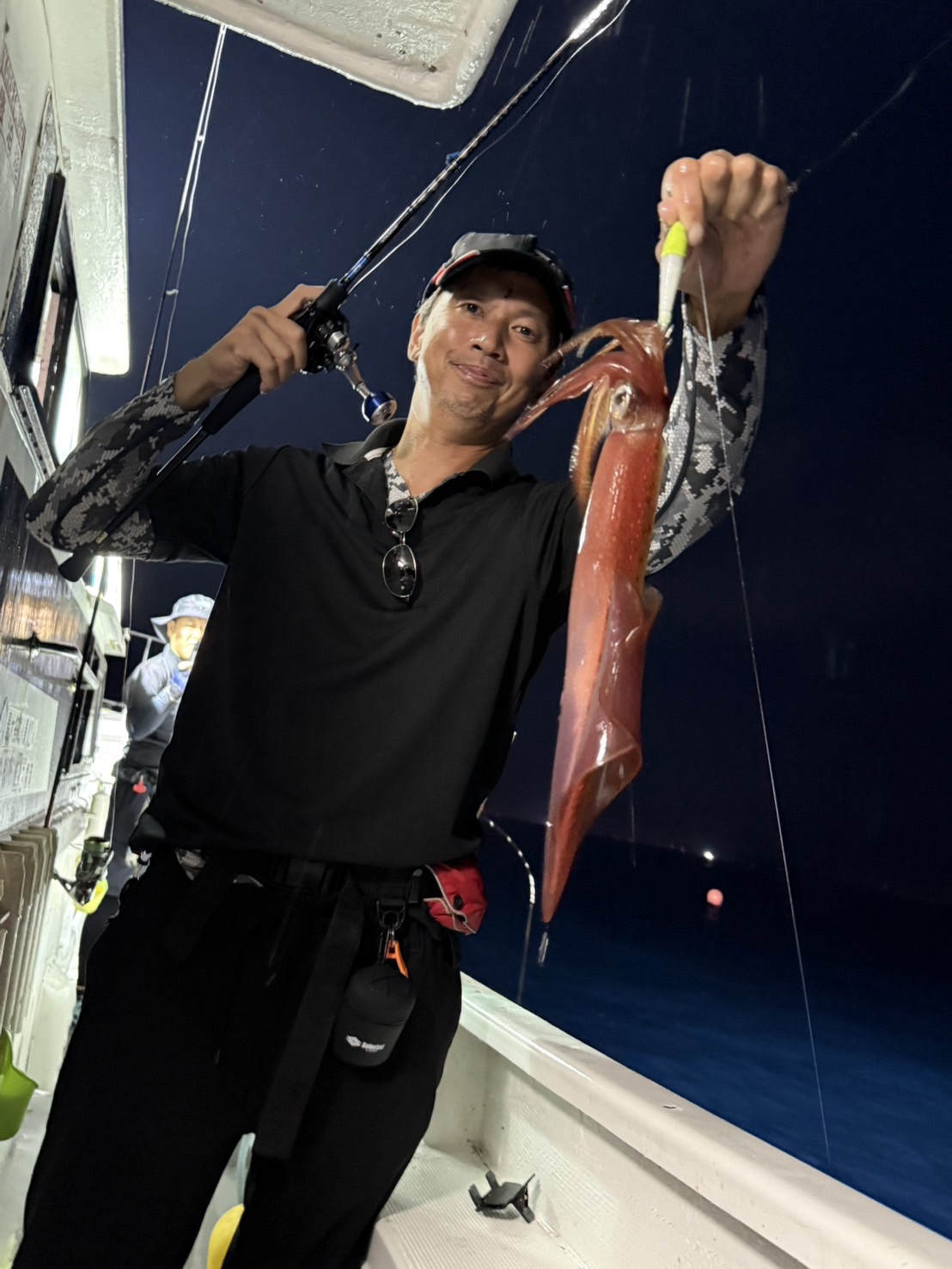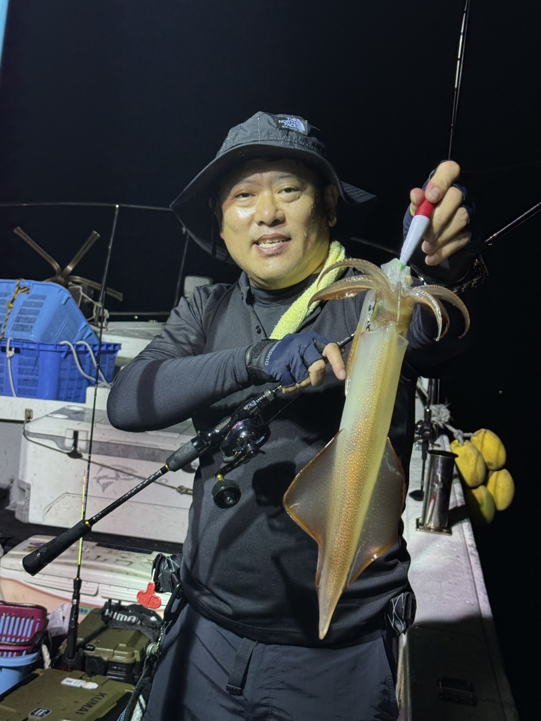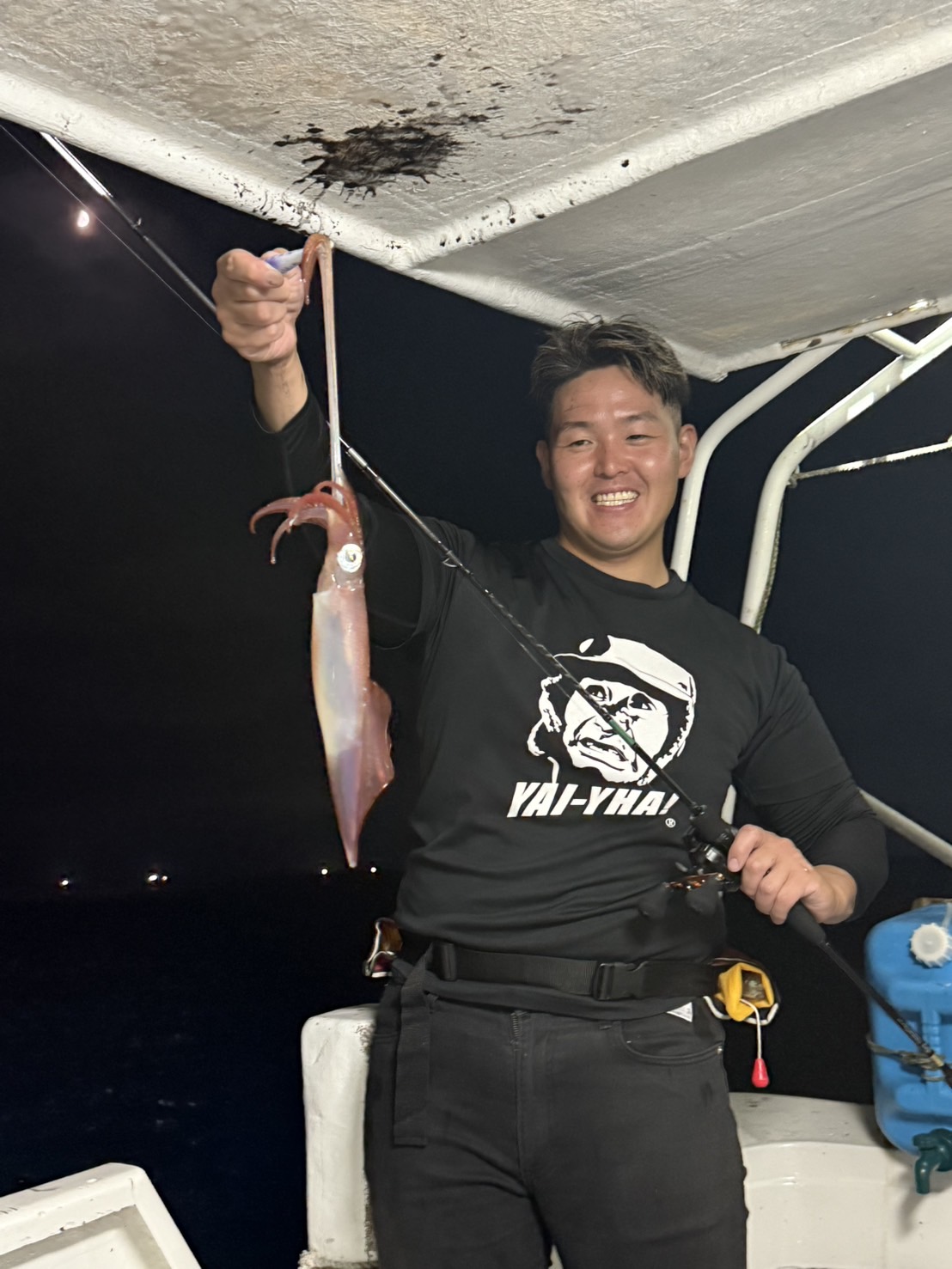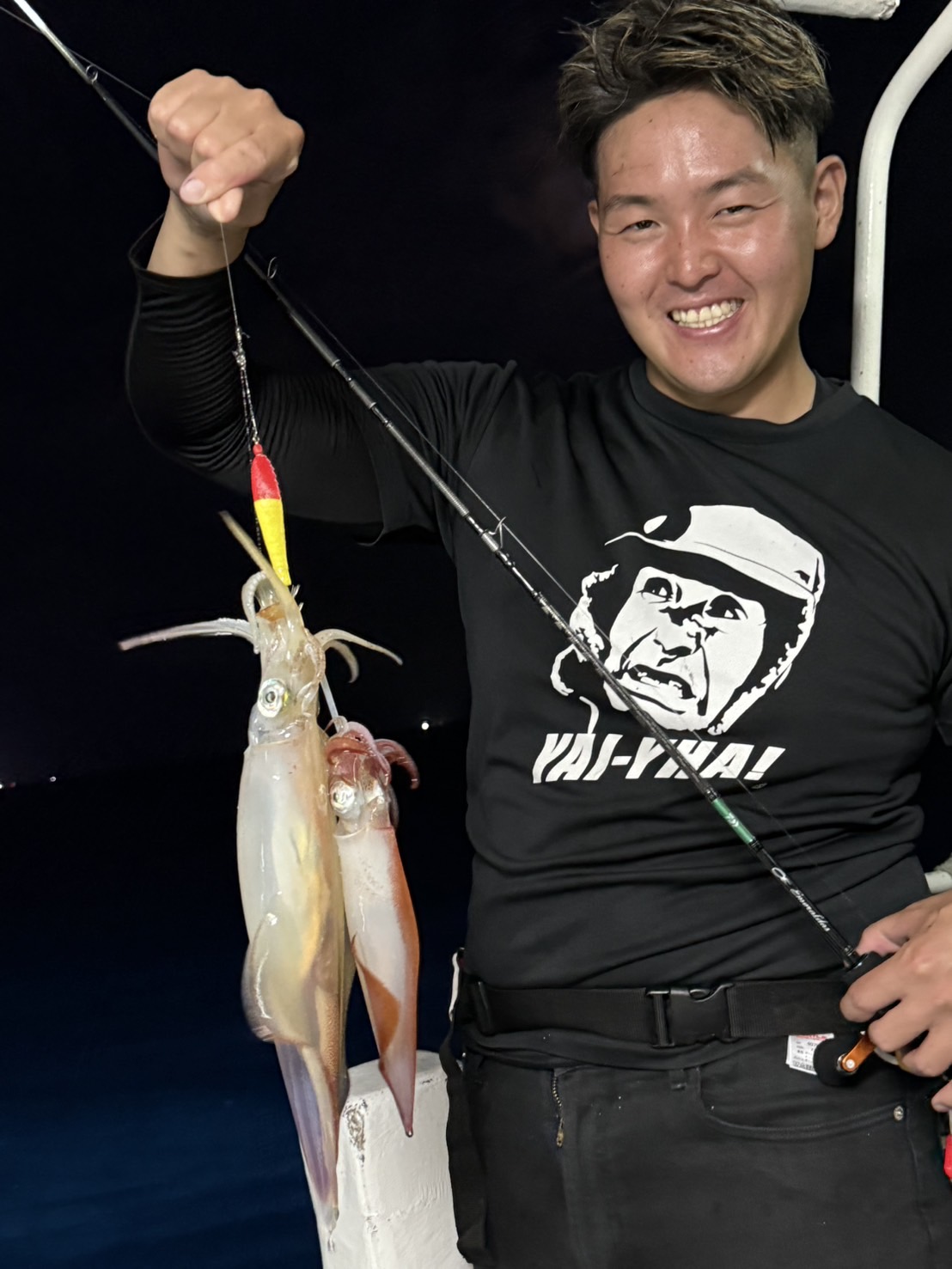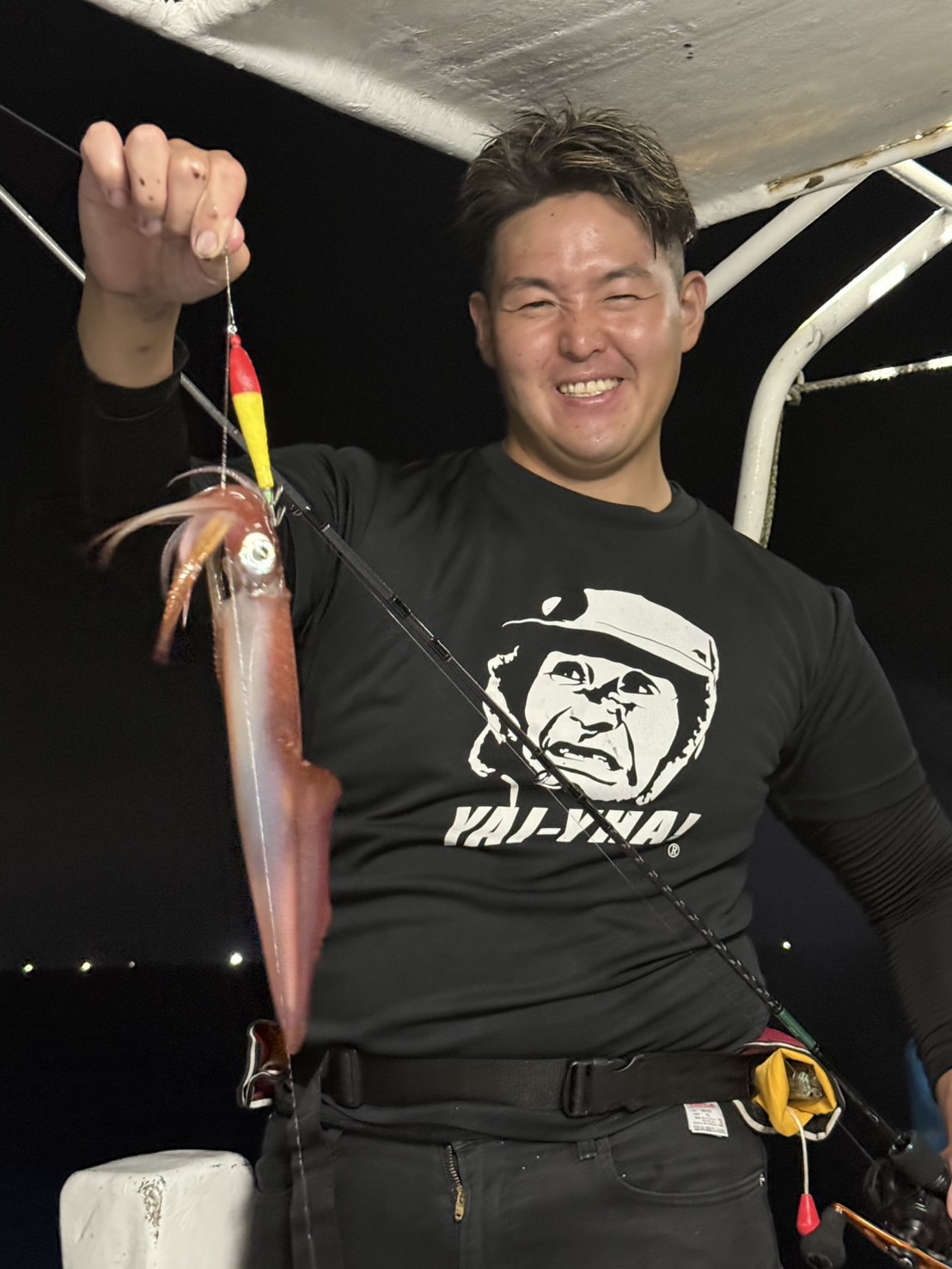この日は少し早めに唐泊漁港を出船。風に船を立てて流しながら、夜焚きイカ釣りをスタートしました。序盤はポツポツとイカを拾っていく展開。やがてパラシュートを入れる時間になり、夜焚きの準備も整いました。日が沈んだ直後は当たりも少なめ。それでも、イカのエサとなるベイトが集まりはじめると、ようやく時合いに突入。ここから一気に当たりが出はじめ、船上は活気ある雰囲気に。今回は全体的に良型が多く、ダブルヒットの確率もかなり高め。数を狙う方もいれば、型にしぼってじっくり拾っていく方も。小イカをリリースしてくれる釣り人も多く、最終的には釣る人で60〜70杯ほどとなりました。イカのサイズも申し分なく、皆さんの笑顔が印象に残る一日となりました。