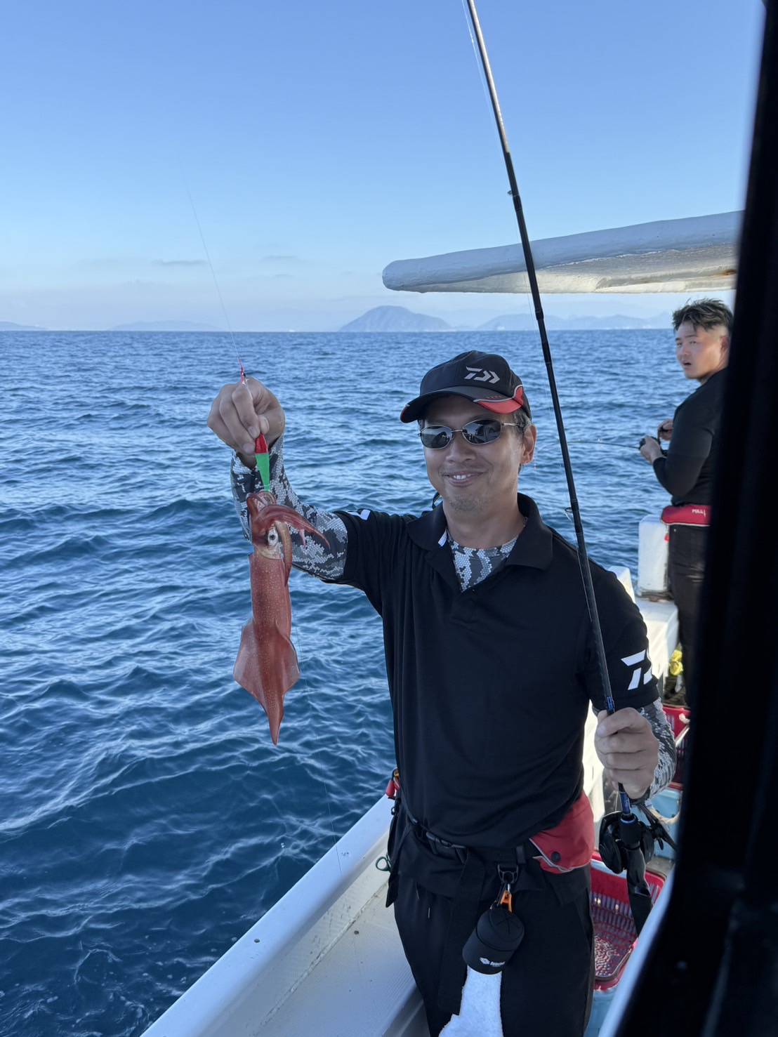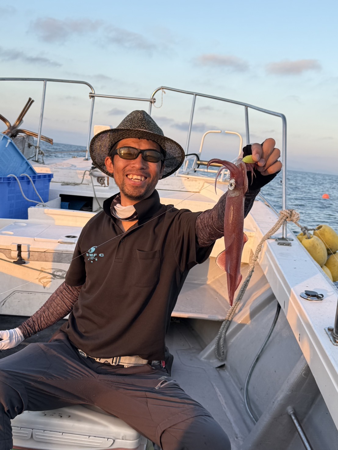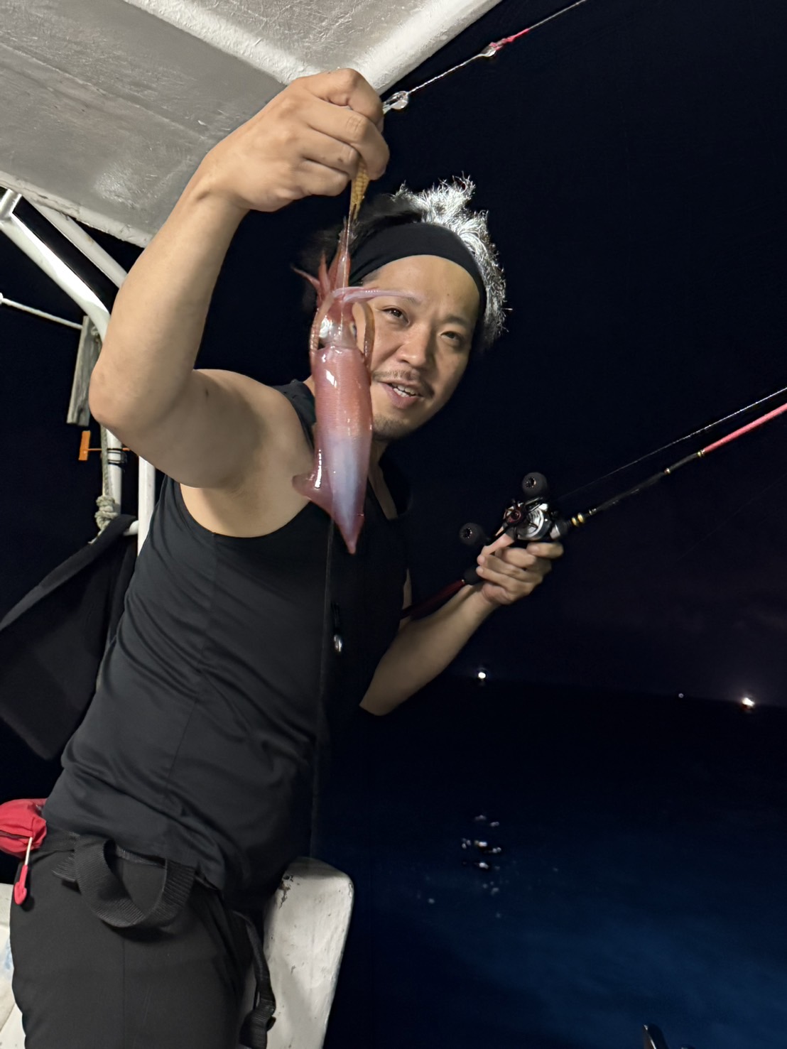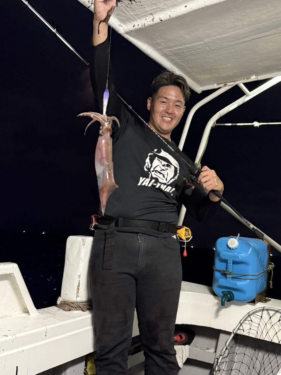 この日は少し早めに唐泊漁港を出船。風に船を立てて流しながら、夜焚きイカ釣りをスタートしました。序盤はポツポツとイカを拾っていく展開。やがてパラシュートを入れる時間になり、夜焚きの準備も整いました。日が沈んだ直後は当たりも少なめ。それでも、イカのエサとなるベイトが集まりはじめると、ようやく時合いに突入。ここから一気に当たりが出はじめ、船上は活気ある雰囲気に。今回は全体的に良型が多く、ダブルヒットの確率もかなり高め。数を狙う方もいれば、型にしぼってじっくり拾っていく方も。小イカをリリースしてくれる釣り人も多く、最終的には釣る人で60〜70杯ほどとなりました。イカのサイズも申し分なく、皆さんの笑顔が印象に残る一日となりました。